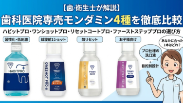 歯の健康【歯科衛生士が解説】歯科医院専売モンダミン4種を徹底比較 歯科医院で勧められるモンダミンは4種類。ハビットプロ・ワンショットプロ・リセットコートプロ・ファーストステッププロの違いと選び方を歯科衛生士が目的別に分かりやすく解説します。2026.01.23歯の健康