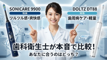 歯の健康【2026年最新版】ソニッケアー9900とドルツDT88を徹底比較|歯科衛生士が本音でおすすめする選び方 ソニッケアー9900とパナソニックドルツDT88を歯科衛生士が本音で比較。ツルツル感・歯周病予防・音・重さ・使いやすさの違いを解説し、後悔しない選び方が30秒で分かります。2026.01.21歯の健康