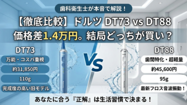 歯の健康【徹底比較】パナソニック ドルツ DT73とDT88の違い|歯科衛生士が本音で解説 パナソニックドルツDT73とDT88の違いを歯科衛生士が徹底比較。歯間ケア性能・軽さ・価格差を解説し、あなたに合うモデルが分かります。2026.01.20歯の健康