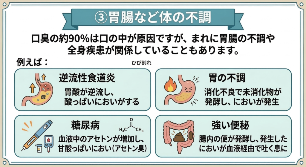 口臭の約90%は口の中が原因ですが、まれに胃腸の不調や全身疾患が関係していることもあります。