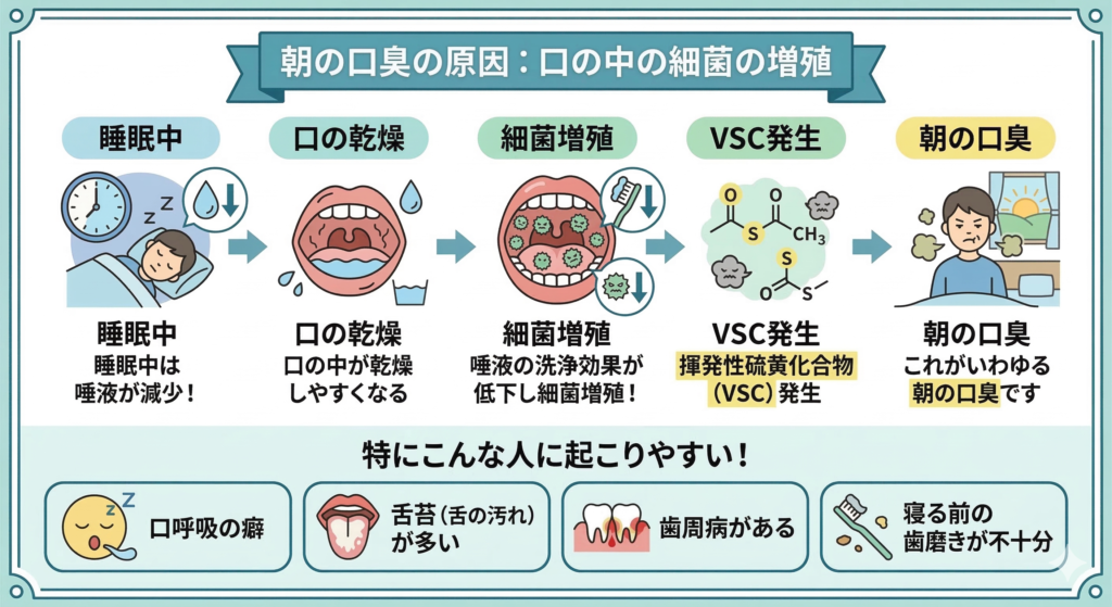この細菌がにおいの原因物質を作ることで、いわゆる**「起床時口臭」**が発生します。