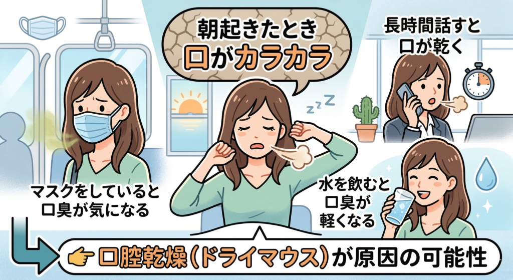 👉 口腔乾燥(ドライマウス)が原因の可能性