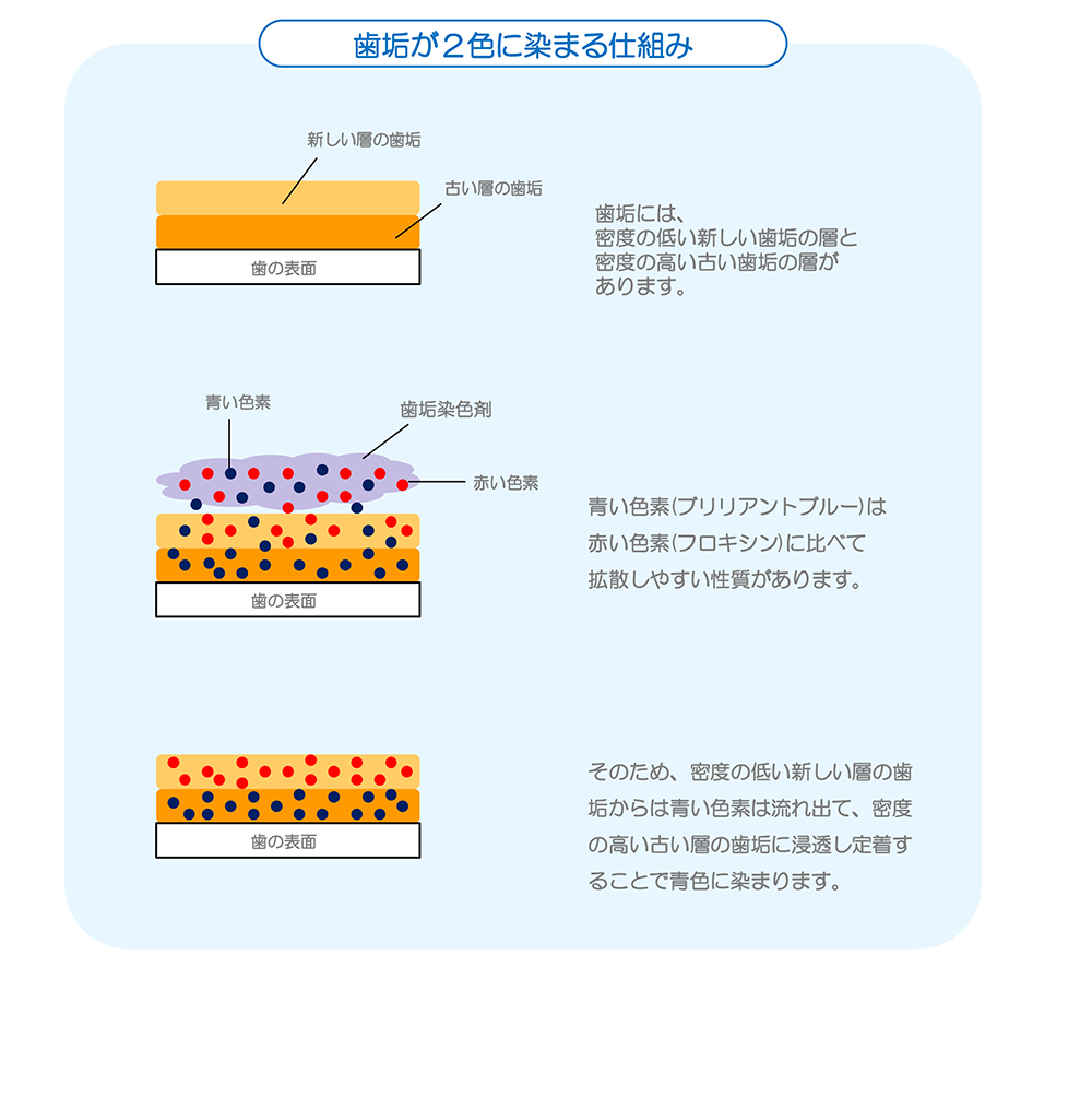 古い歯垢が青、最近の歯垢が赤に染まるタイプなので、磨き残しの状況がとてもわかりやすい。商品仕様でもこの2色染めを強調しています。fordynet(フォルディネット)